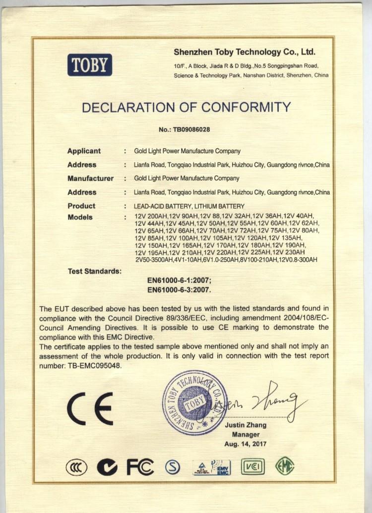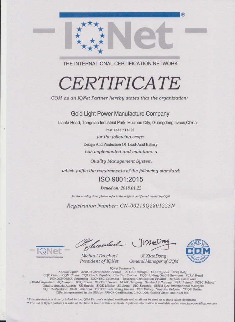 A Gold Light Power rendelkezik ISO 9001: 2015, ISO 14001: 2015, CE-tanúsítvány - Autóakkumulátor/Karbantartásmentes autóakkumulátor/Vrla-akkumulátor/Ups-akkumulátor/Szolár akkumulátor/Opzs-akkumulátor/Opzv-akkumulátor